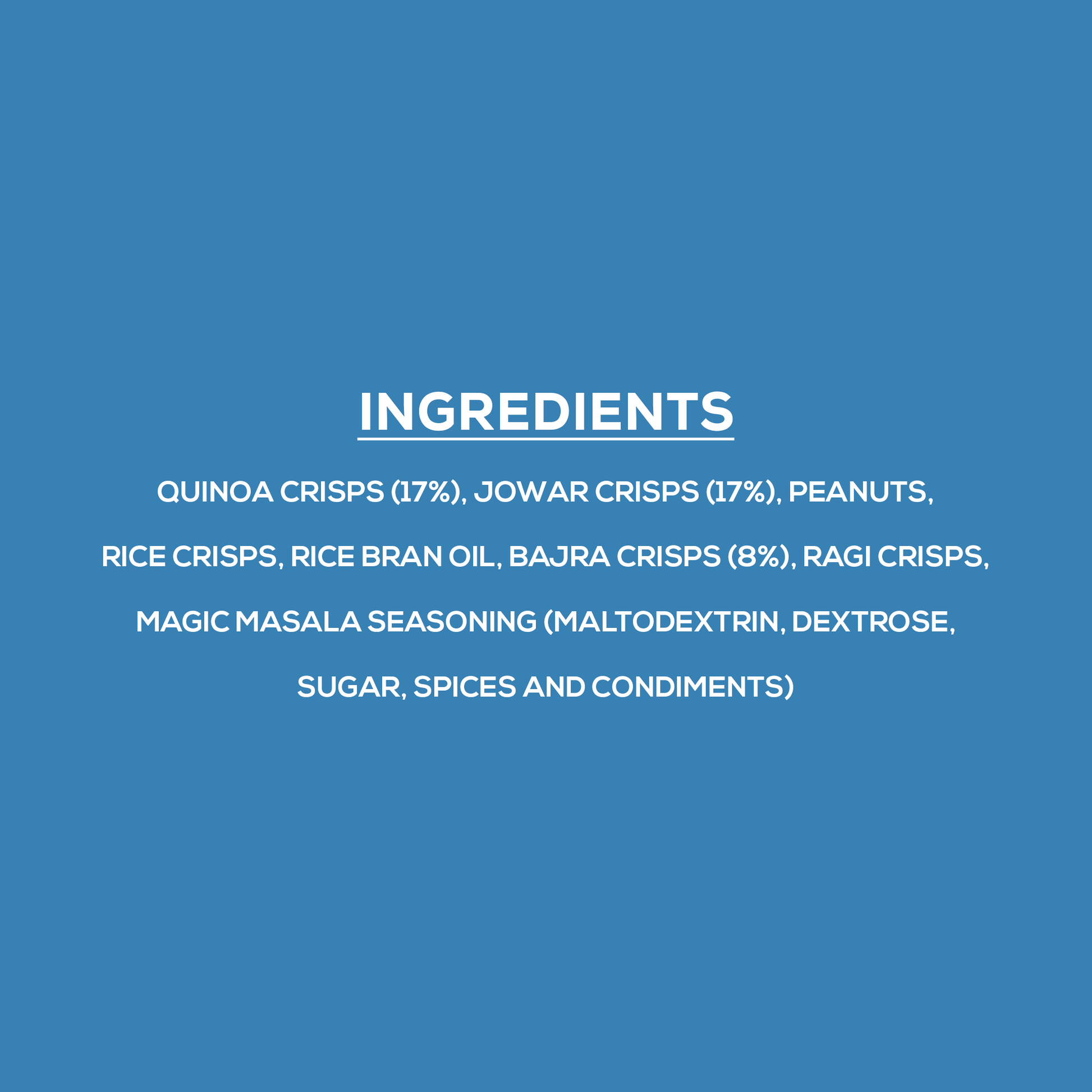 Quinoa Crispy (17%), Jowar Crispy (17%), Peanuts, Rice Crispy, Rice Bran Oil, Ragi Crispy, Bajra Crispy (8%), Magic Masala Seasoning (Maltodextrin, Dextrose, Sugar, Spices and Condiments)