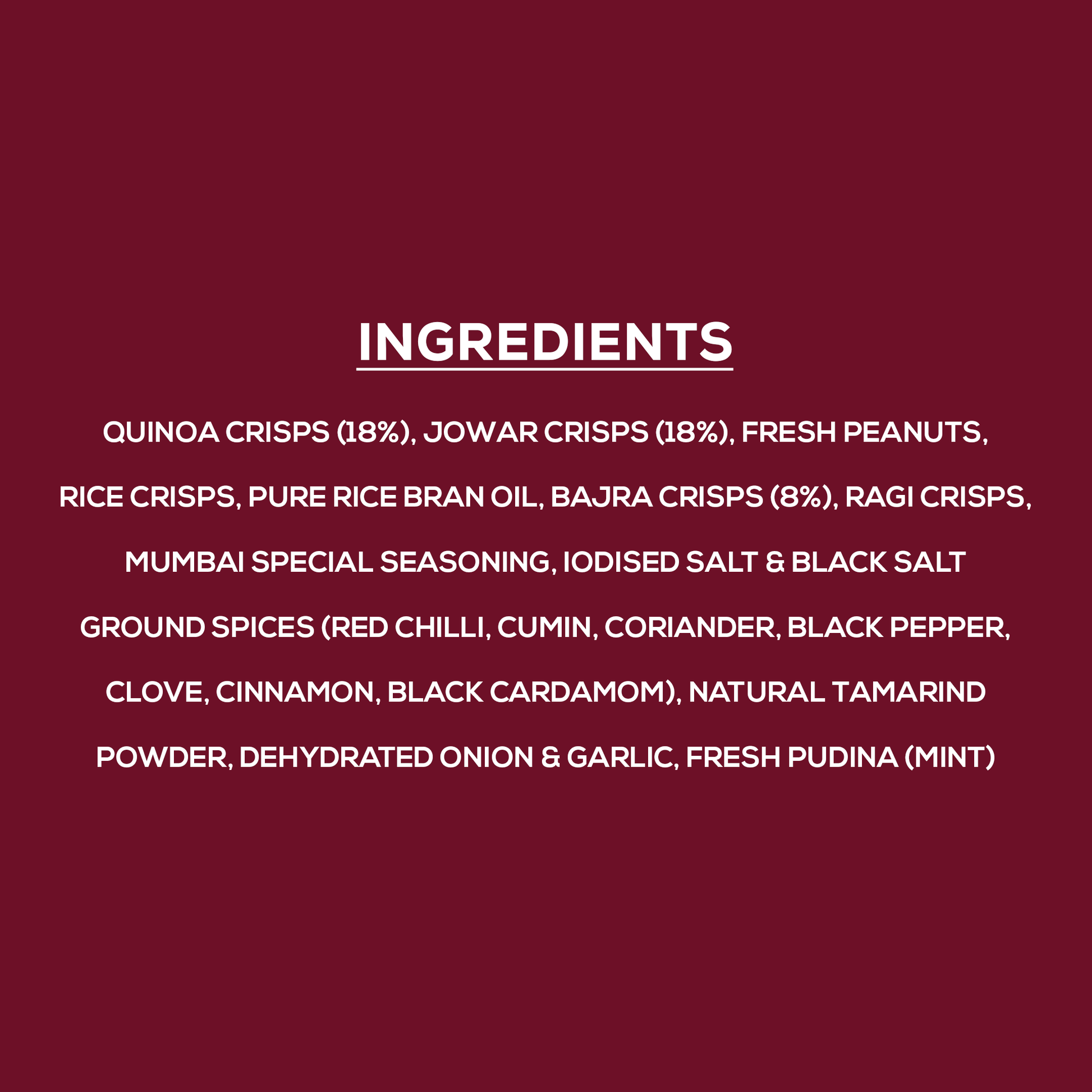 Quinoa Crispy (17%), Jowar Crispy (17%), Peanuts, Rice Crispy, Rice Bran Oil, Ragi Crispy, Bajra Crispy (8%), Bambaiya Bhel Seasoning (Maltodextrin, Dextrose, Sugar, Spices and Condiments)