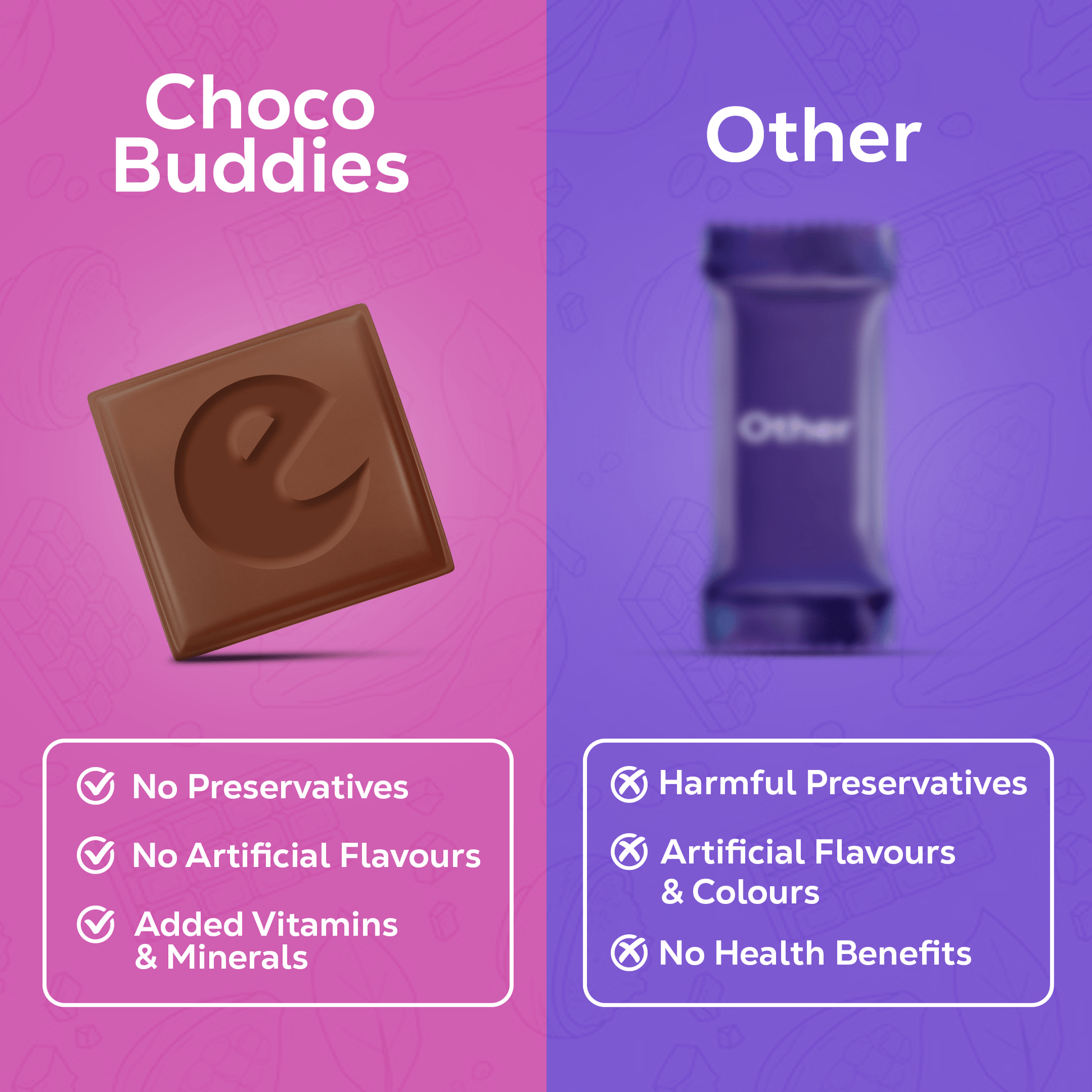 Choco Buddies is designed for kids aged 4 years and above. Each bite-sized chocolate is made keeping young tummies and nutritional needs in mind.