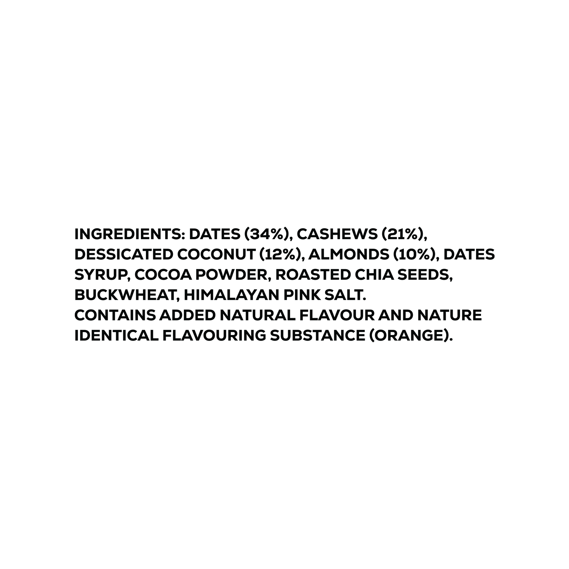 Dates, Cashew nuts, Coconut, Orange Flavour, Almonds, Cocoa powder, Chia seeds, Buckwheat, Himalayan pink salt, Vanilla flavor