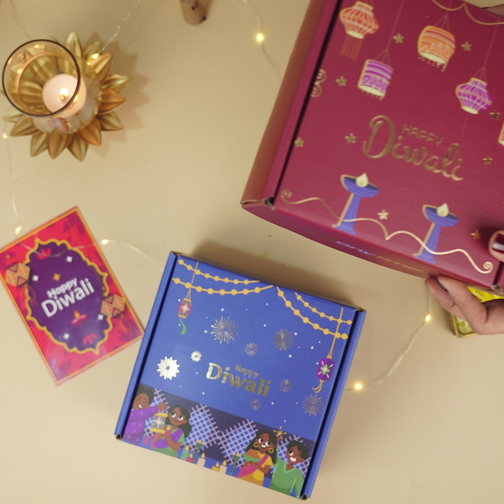 11-Items Diwali Gift Box with Dry Fruits, Chocolates, Date Laddoos, Roasted Namkeen, Beautiful Diyas, Rangoli, Lights & more