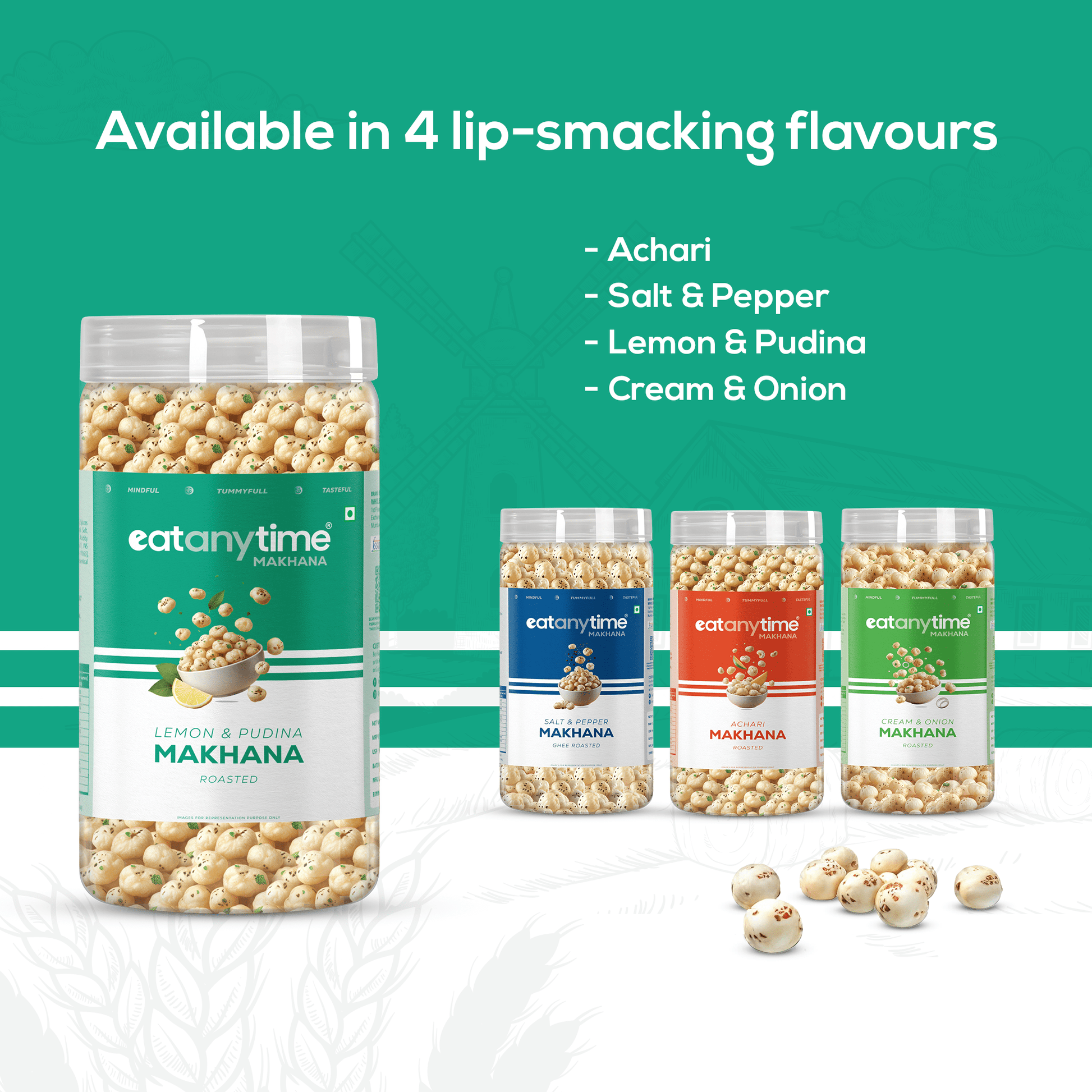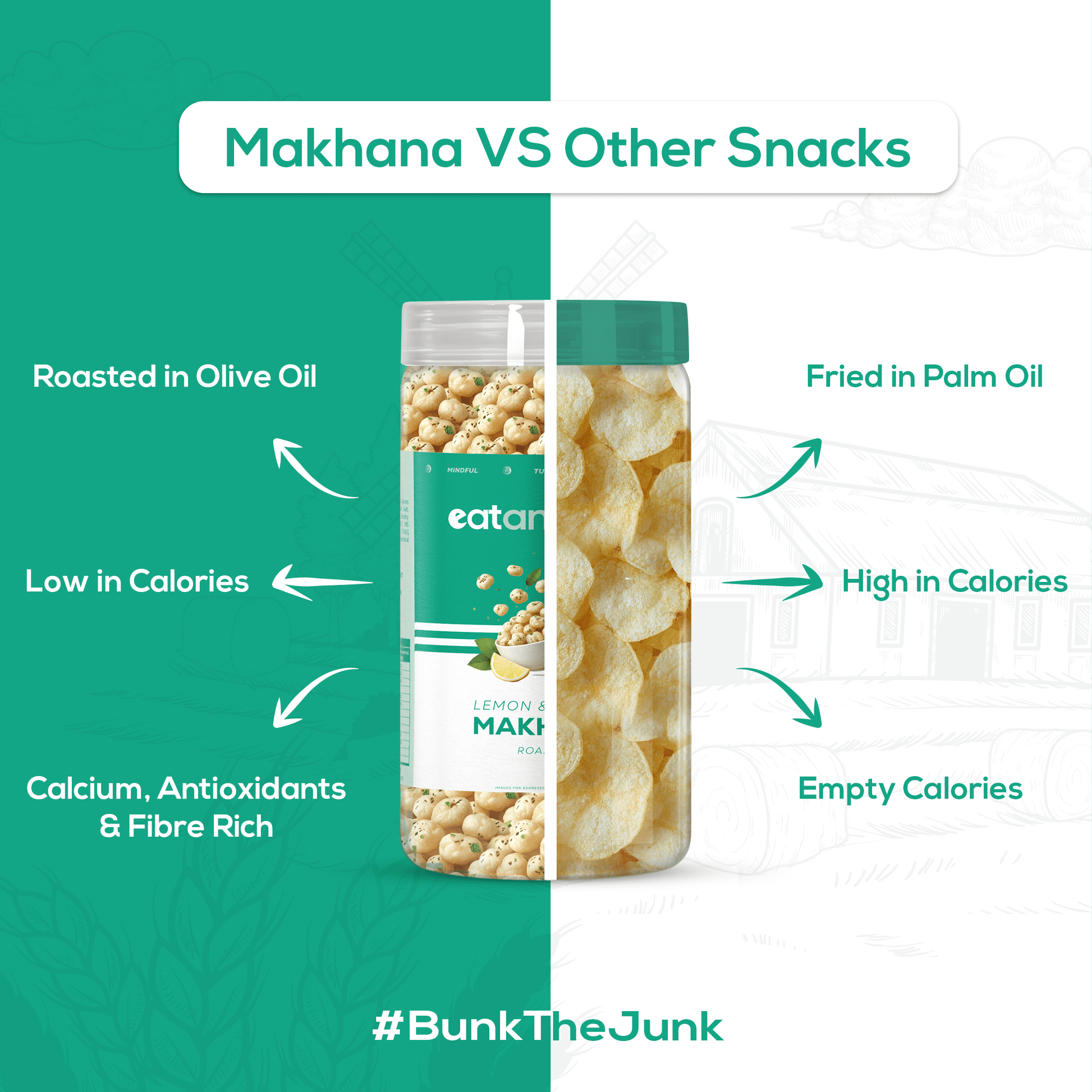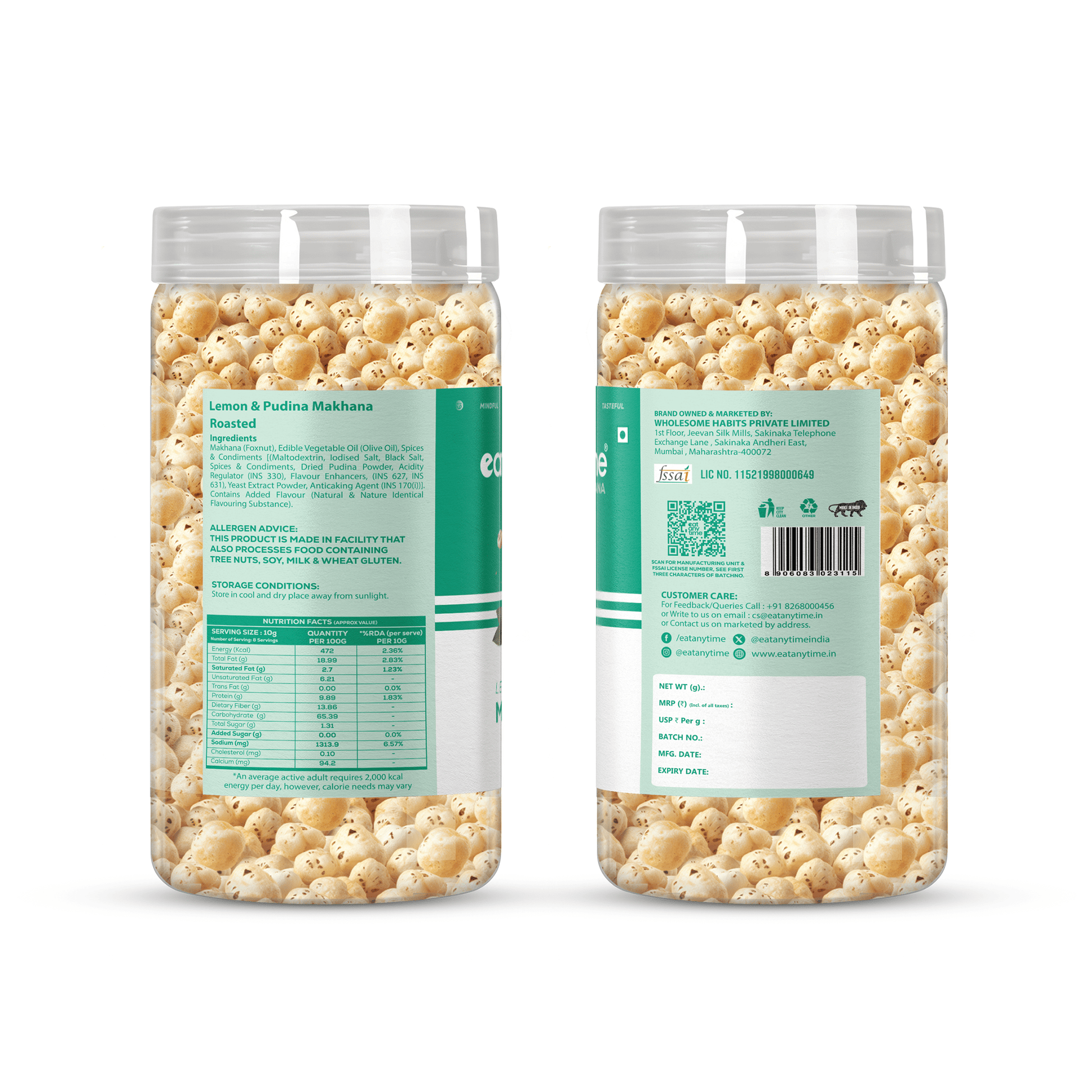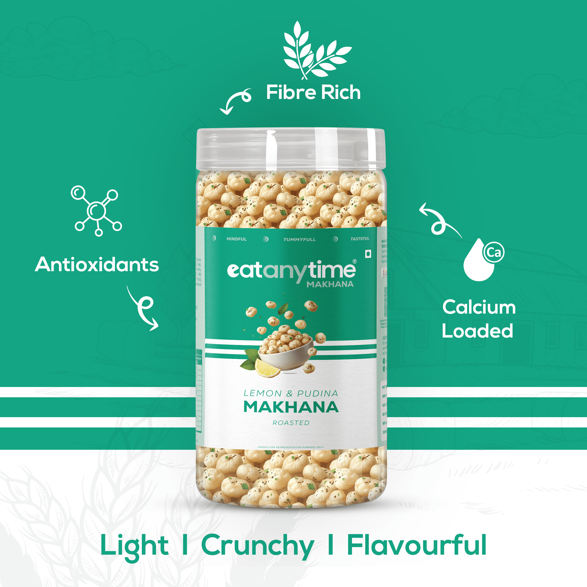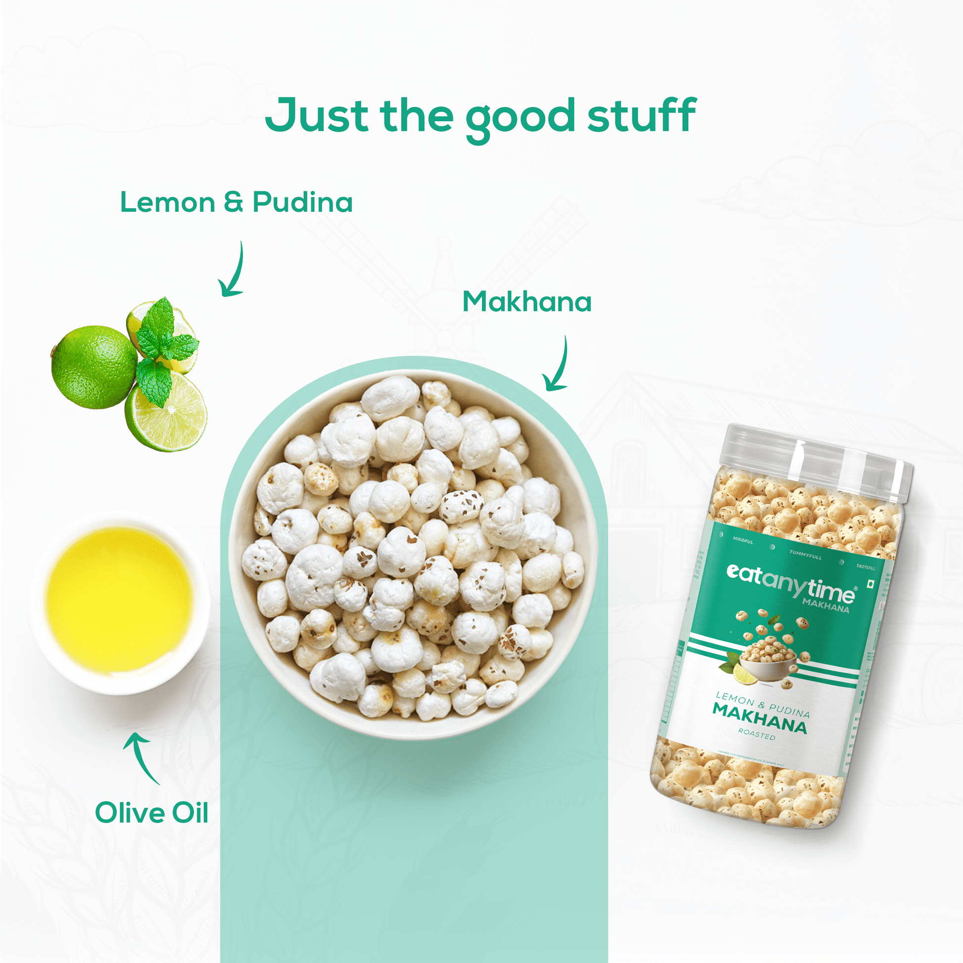 Light, crunchy, and chatpata! Our Lemon Pudina Makhana brings together zesty lemon and cool mint in a snack that’s as refreshing as it is tasty. Roasted in olive oil and perfectly seasoned, it's a great companion for road trips, lunch breaks, or mindful munching at home.